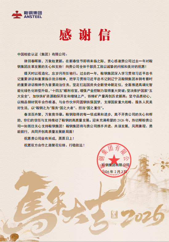 近日,中国中检辽宁公司(东北区域总部)收到鞍钢集团的感谢信。既是对过去一年双方战略合作成效的高度肯定,也是对中国中检辽宁公司(东北区域总部)技术实力与责任担当的充分认可。